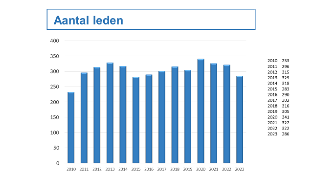 Het ledenaantal blijft alle jaren schommelen rond 300. Na de ‘topjaren’ 2013 en 2014 met resp. 328 en 318 leden zagen we een daling naar 283. Tijdens de corona jaren 2020 en 2021 zagen we opnieuw een verhoging naar 341 en 327 leden. Nu zien we toch ook weer een daling naar 322 in 2022 en 286 leden in 2023.