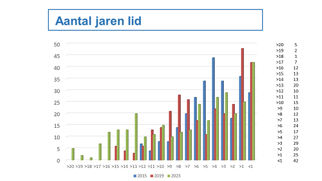 Door het trouwe deel in het ledenbestand zien we ook de gemiddelde leeftijd van de leden toenemen. Deze was in 2012, 2015, 2019 en 2023 resp. 53, 56, 59 en 62 jaar.